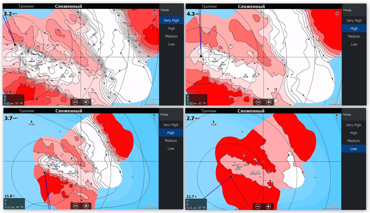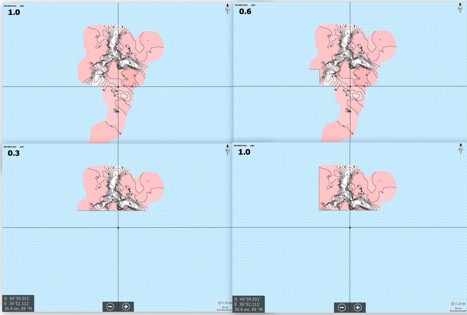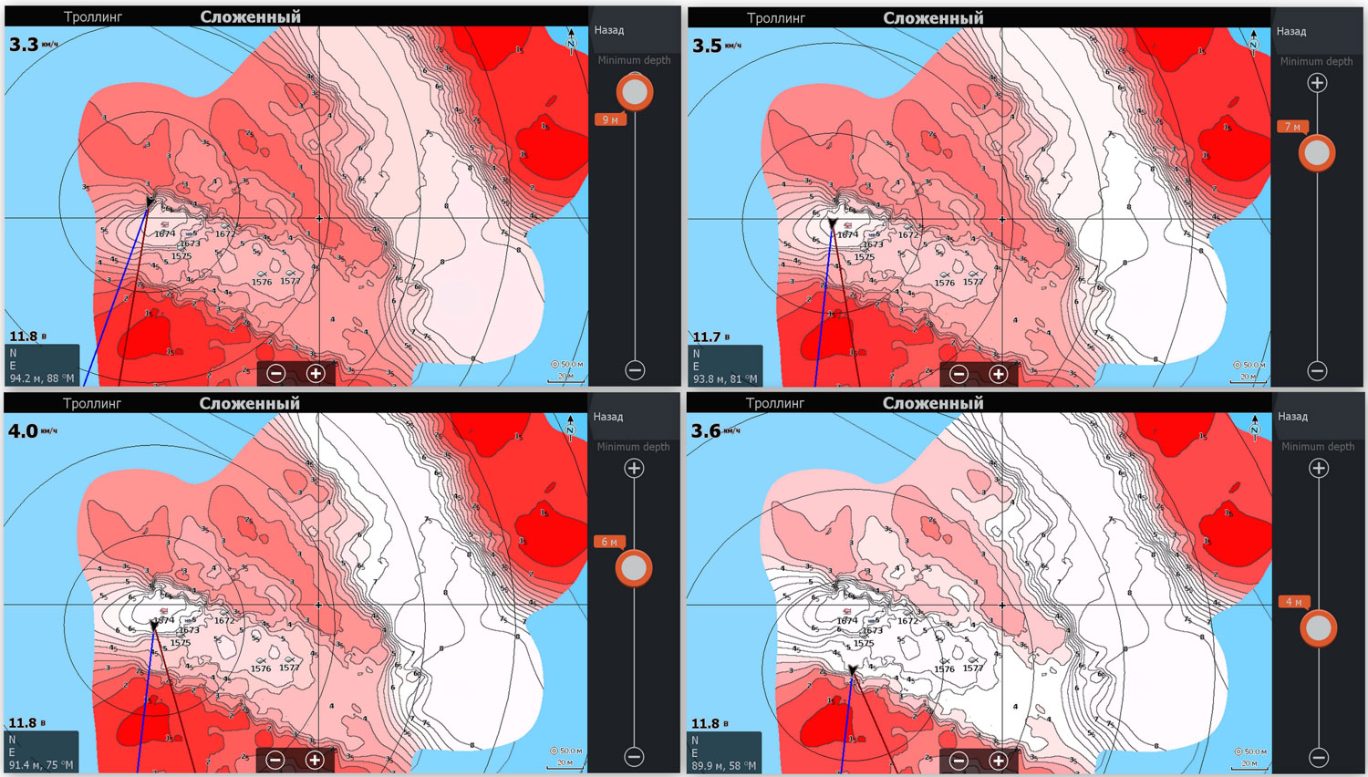 • Minimum depth з крайніми значеннями бігунка 0-9 метрів. Даним пунктом Ви підсвічуєте (білим кольором) необхідний діапазон, інші переходять з червоного в рожевий від мілини до глибини.