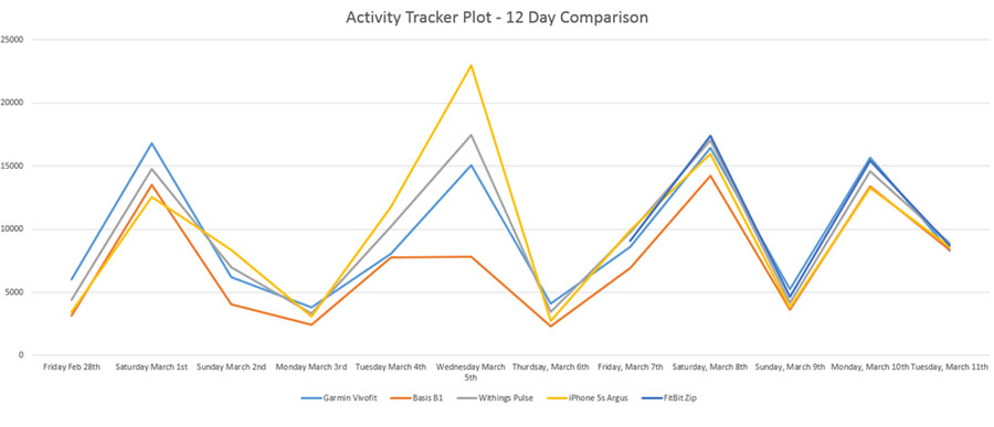 Поэтому, в качестве небольшого эксперимента, я в течение 10 дней отслеживал, как трекеры активности различных брендов справляются со своей задачей, а именно с построением графиков активности. Я не знаю, какой из приборов предоставляет наиболее или наименее достоверные данные. Хотя в некоторых случаях было определенно ясно, что показания одного из приборов 100% ошибочны (например, непонятно почему Basis B1 зафиксировал такую низкую активность в среду).
