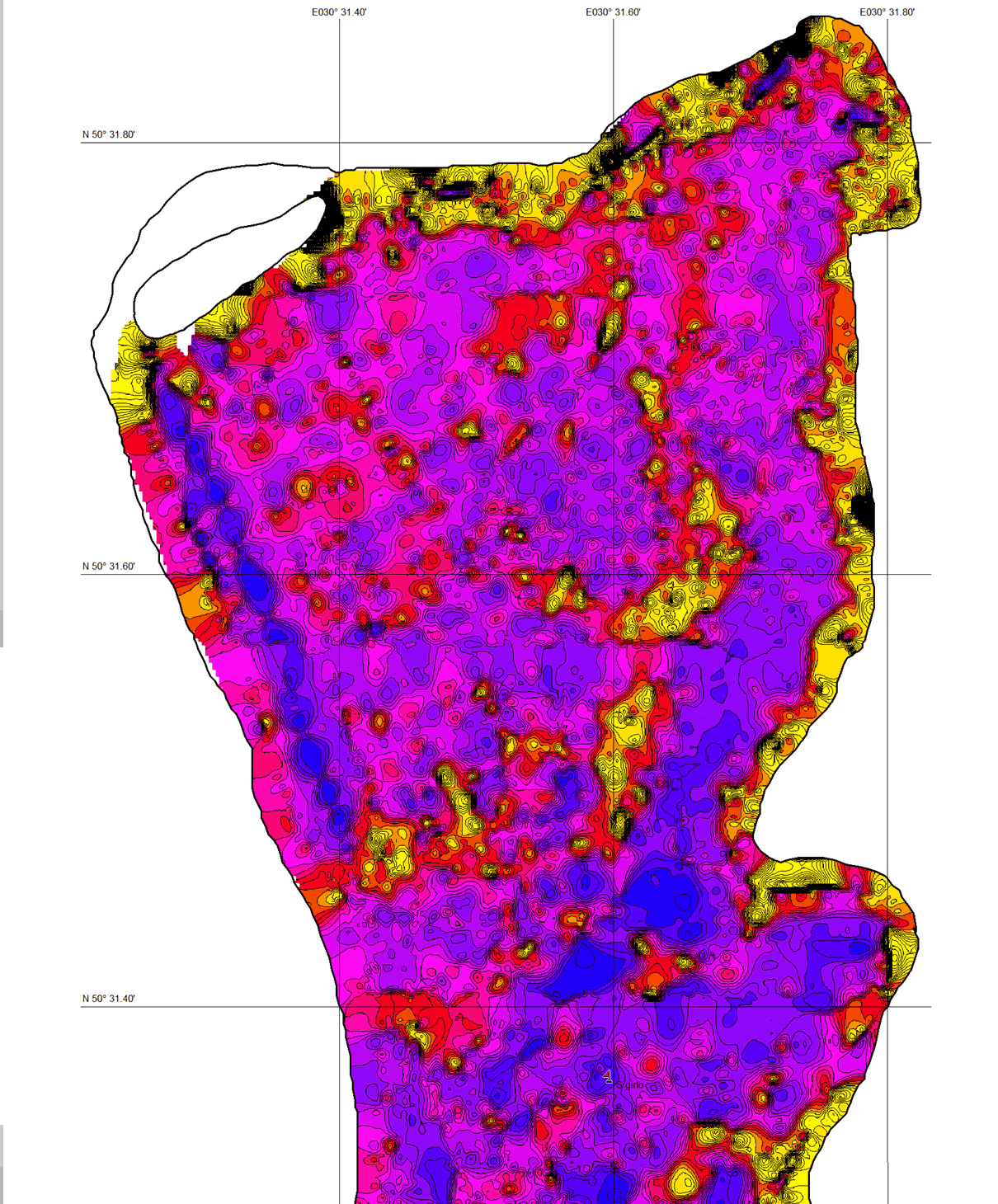К карте прилагается цветовая линейка с соответствием цвета цифре плотности дна. Единицы мне не известны, но вполне достаточно просто понимания, где тверже, а где мягче.