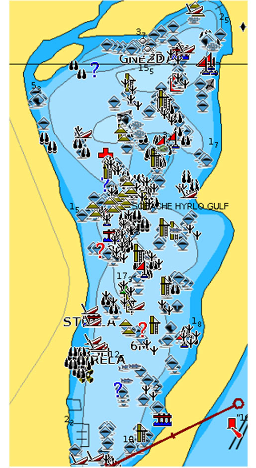 По большому счету это та же растровая карта, но в данном случае она отображает не профиль глубин, а наличие и форму всевозможных подводных структур (объектов) до мельчащих деталей (вплоть до булыжника). Я выделил такую карту в отдельную группу, так как она ни на что не похожа из того, что мы привыкли видеть в водных картах.