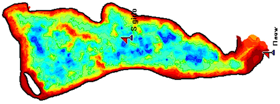 Чем ближе к желтому, тем плотность выше, а чем больше синего цвета, тем она мягче. Этот залив ярко выделяется разным по плотности грунтом. В ямах очень много ила (до 1.5 метра), тогда как бугры и свалы достаточно твердые (песок).