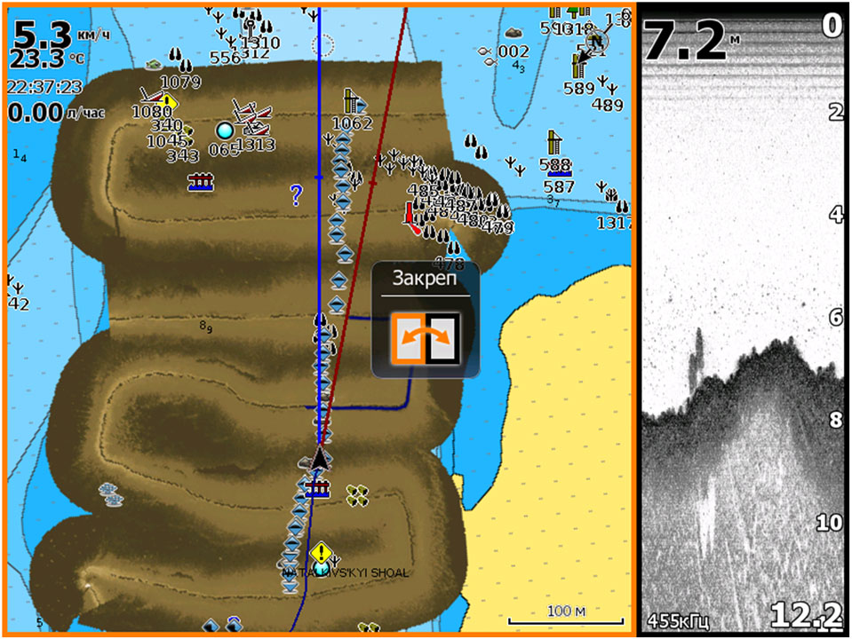 Недостатки: при движении в режиме «ориентация по ходу движения», то есть когда карта разворачивается перед носом Вашей лодки, соответственно все надписи на карте тоже будут разворачиваться вплоть до положения вверх ногами. По сути, лично меня это не напрягает, так как основные надписи карты – это изобаты (цифры глубины) читаются легко, да и чаще всего можно обойтись вообще без них, так как на большинстве карт контуры глубины изображены в разных цветах.