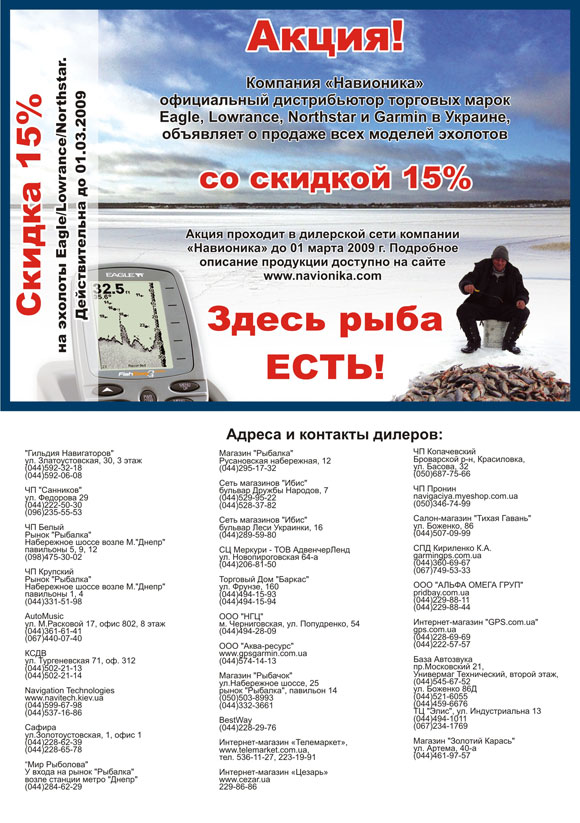 Если ты – заядлый рыбак и проводишь все свободное время на льду, тогда ты можешь стать счастливым обладателем флаера с 15% скидкой на ЛЮБУЮ модель эхолота. Акция проходит с 04.02.2009 по 01.03.2009 в дилерской сети компании «Навионика». Скидка действительно только при предъявлении флаера.