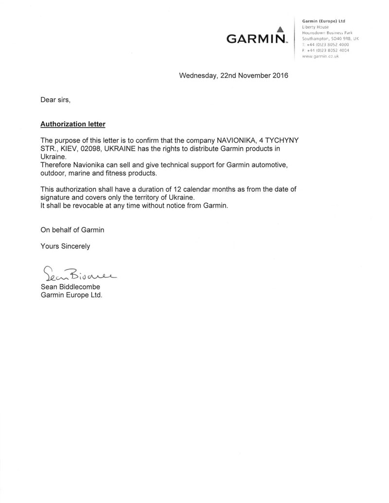 Назначением данного письма является подтверждение того, что компания Навионика, 02098, Украина, Киев, пр-т П. Тычины, 4, имеет права на дистрибуцию продукции Garmin на территории Украины. Поэтому, компания Навионика имеет право продавать и осуществлять сервисную поддержку продукции Garmin автомобильного, портативного, морского и спортивного направлений.