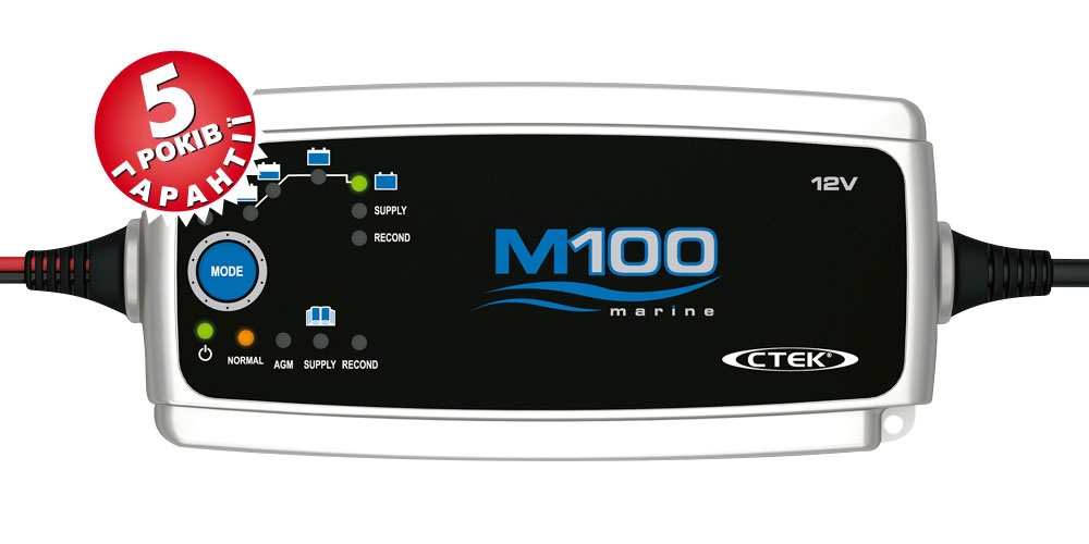 CTEK M100 - відмінний зарядний пристрій для морського транспорту, що забезпечує належний догляд для батарей малих і середніх катерів потужністю 12В. CTEK M100 являє собою повністю автоматизований, 8-ступеневий зарядний пристрій, який може служити і в якості зарядки, і як джерело живлення. Пристрій подає струм 7А та ідеально підходить для акумуляторних батарей ємністю 14-150Аh (до 225Аh в режимі профілактичної зарядки). Витрати зворотного струму менш ніж 1Ah на місяць*. Пристрій виробляє струм з коливаннями напруги не більше 4% **.