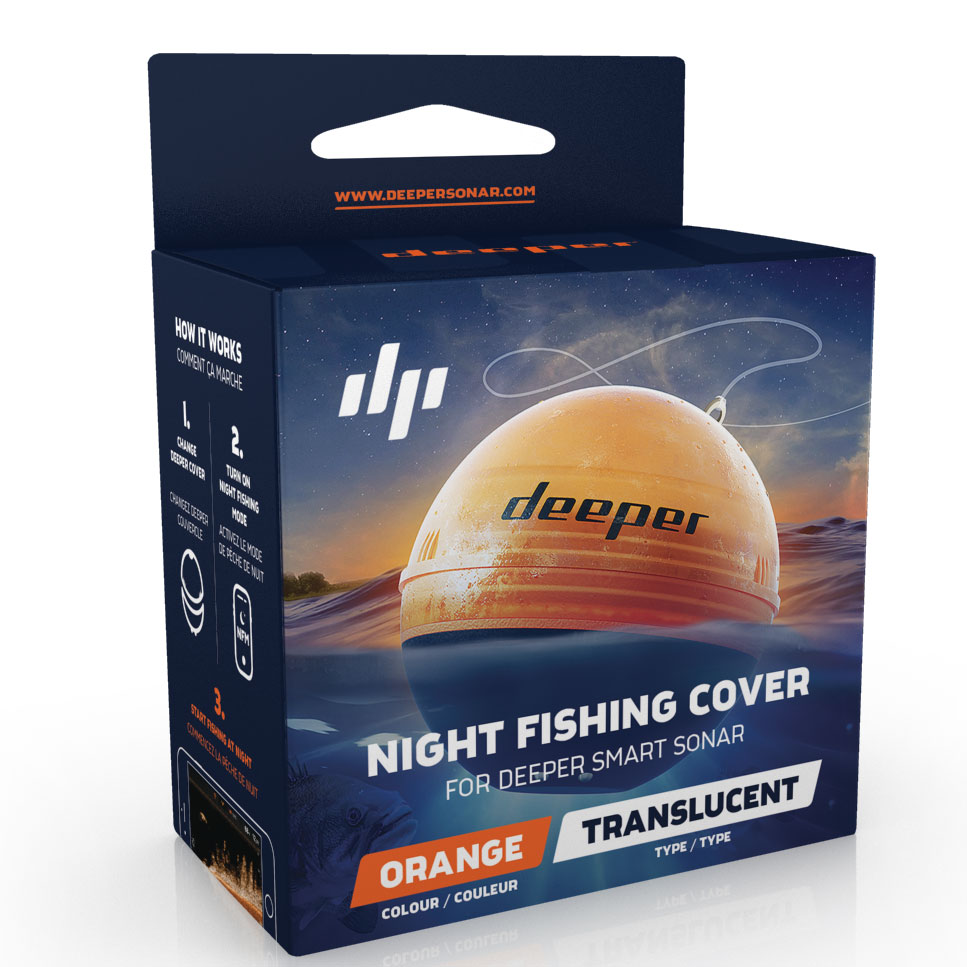 Отримайте максимум від ехолота Deeper вночі — скористайтеся спеціальними накладками для нічної риболовлі. Активуйте режим нічної риболовлі ехолота в додатку, після чого спалахне яскравий світлодіод, який підсвітить прозору накладку; ехолот почне світитися в темряві, і ви вже не втратите його із виду.